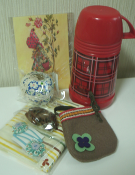 携帯ケース。スーちゃんのポストカード。材料を少々。