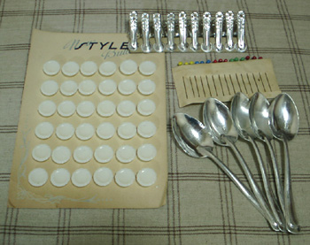 レトロなボタンと、ガラスのまち針、小さくてかわいいアルミのピンチと、アルミのスプーン。